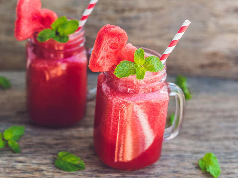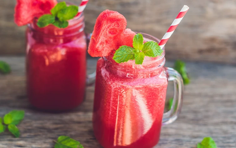 Retire a casca e os caroços da melancia. Bata todos os ingredientes no liquidificador e sirva.
