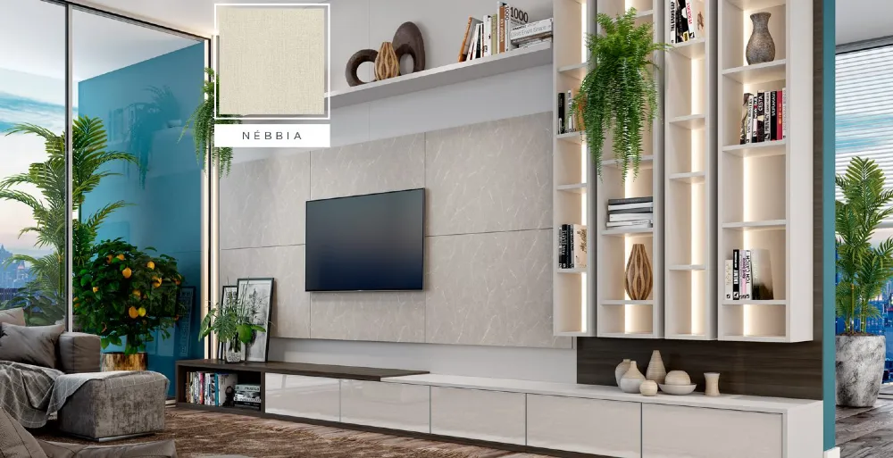 Com tonalidade clara e desenho sutil, o padrão Nébbia é inspirado na suavidade das nuvens, desenvolvido para harmonizar com os demais padrões e possibilitar ambientes mais sóbrios e neutros. A mescla do desenho delicado, com a textura de tecido, confere versatilidade na sua aplicação, permitindo que funcione como tecido, ou como unicolor com microtextura. Seu nome é inspirado na névoa.