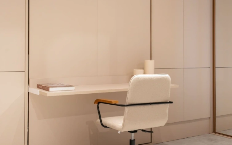 - Home office multifuncional: em um quarto pequeno, uma parede pode ser dedicada a um sistema giratório que inclui a cama e uma mesa. Isso permite que o espaço seja usado tanto como escritório quanto para dormir. E uma iluminação distribuída em vários pontos de luz proporciona uma luz suave e eficiente, tendo a densidade adaptável tanto para momentos de foco, como de relaxamento.
