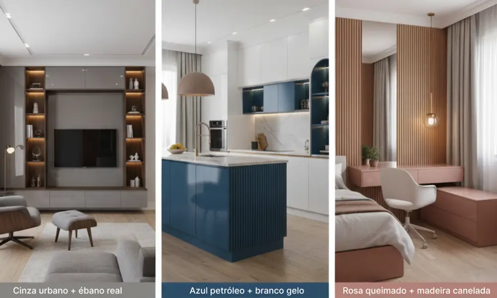 Tons amadeirados com neutros seguem entre os preferidos. A mistura da madeira com cinza, off-white e bege é uma aposta segura para quem quer unir o toque natural com um visual moderno e leve. Nos projetos que pedem mais personalidade, os metálicos e vibrantes aparecem como destaque. Detalhes em dourado, cobre ou preto fosco combinam com cores marcantes — como vinho ou verde escuro — e deixam o espaço mais interessante, sem perder a elegância.